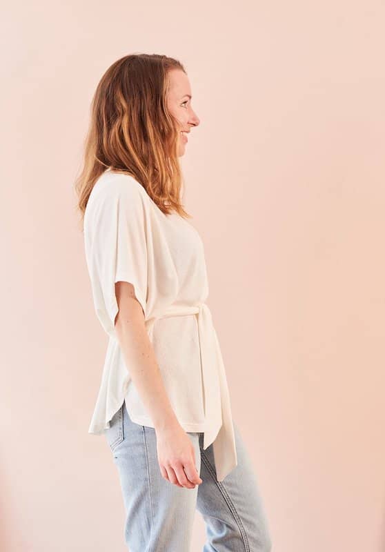 Dette mønsteret inkluderer flere varianter for utringning og ermer. Du kan sy Emma med en rund hals eller V-hals. Du kan velge å brette ermene, og for det er tre lengder inkludert: korte, 3/4 eller lange. Du kan også velge å sy korte ermer med tulipanmanchetter, eller en med 3/4 ermer med strikk.